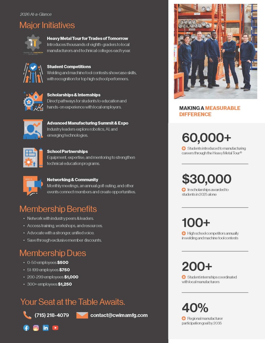 CWIMA members are a collective voice of manufacturers and community leaders from across Central Wisconsin. Together we are collaborating to strengthen and ensure the long-term sustainability of the manufacturing industry. Click on the links below to access more resources and opportunities and maximize your membership:
